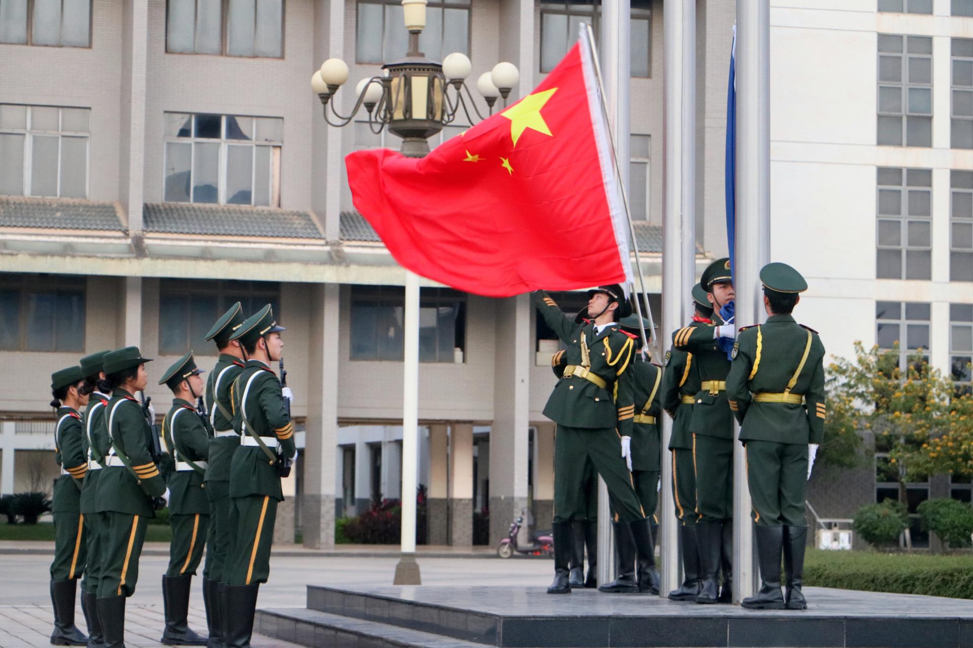 早晨7时,升旗仪式正式开始。着装整齐的国旗护卫队护送着国旗和校旗,伴随着国歌、校歌,三面旗帜缓缓升起,全体师生共唱国歌、校歌,向国旗、校旗行注目礼,充分表达对党和祖国的无限热爱。