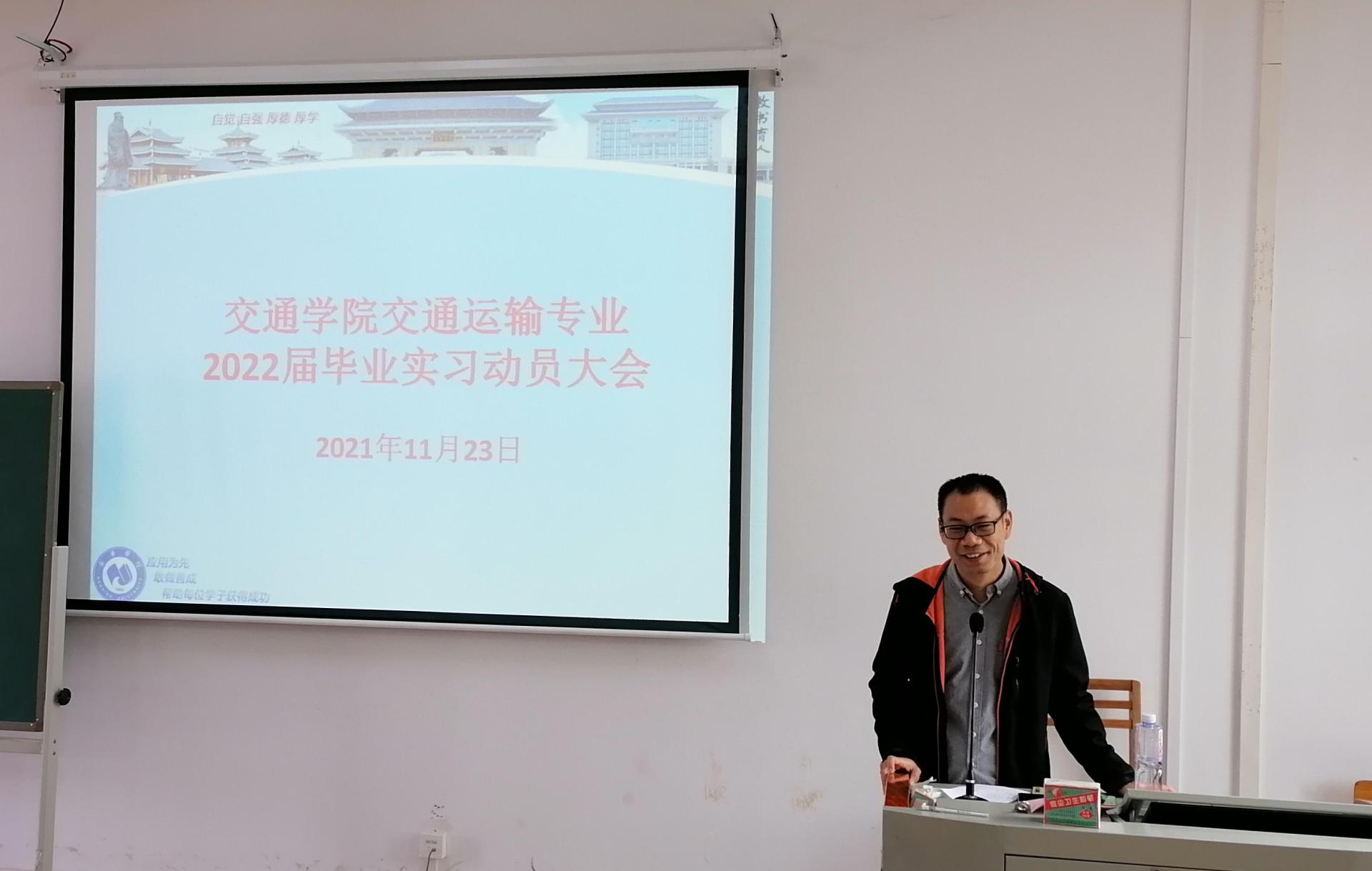 毕业实习是专业教学实践环节的一个重要阶段。为使2022届毕业生能够了解毕业实习的重要性并强调各类共性问题,11月23日上午,按照交通运输和城市轨道交通运营管理专业人才培养方案要求,交通运输教研室组织两个专业学生在南硅谷E502教室召开2022届毕业生实习动员会。本次动员会由陈建球老师主持,庞彦知副院长到场指导。