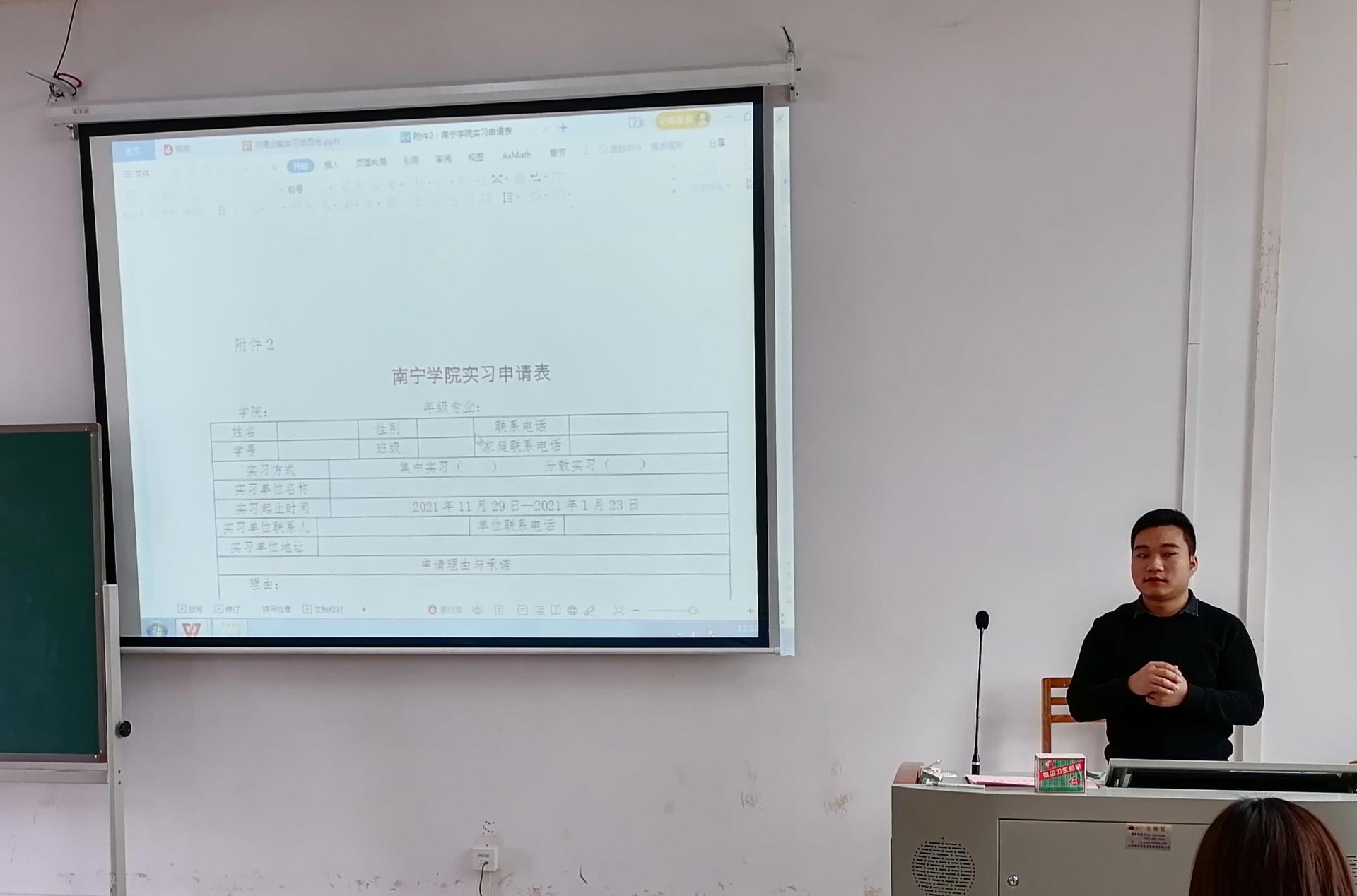 会上,陈建球老师首先向全体毕业生强调了实习安全事项,告知所有同学安全是第一要务,尤其是人身和财产安全。其次,陈老师指出了实习环节对于同学们的重要性,要求大家在思想上给予高度重视,要按照任务书上的要求保质保量的完成实习任务,同时严格遵守实习单位的规章制度与考核标准。陈老师提醒大家在实习过程中要注意收集素材,做好周记的上传工作,以便评定实习成绩。