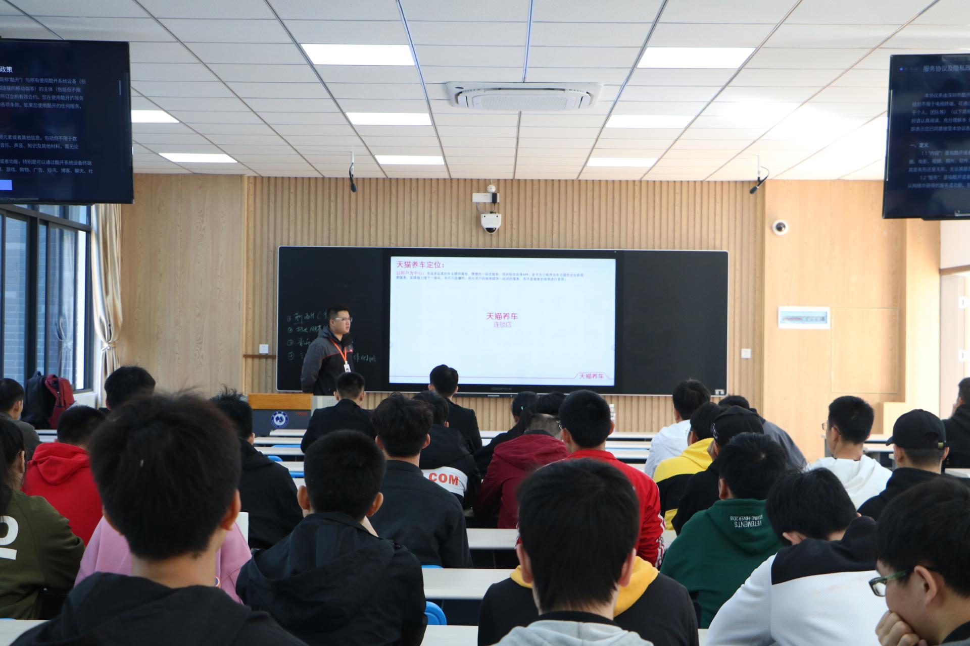 新康众汽配有限公司负责人首先通过视频的方式,让毕业生对贵司有基本的了解。新康众是一家致力于网络覆盖全国的汽车后市场一体化专业服务商。负责人提出让毕业生根据“自己应该需要一份怎样的工作和为什么要选择企业”两个问题思考,同学们通过思考,主动提问,以聊天互动的方式让毕业生们更深入地思考自身定位和工作需求。负责人通过PPT展示向同学们详细的介绍贵司的新项目——天猫养车。因后市场容量快速增长空间广阔,且年轻消费者将逐步成为主流,消费人群移动互联网趋势凸显,对于独立售后门店经营面临诸多挑战和困难。