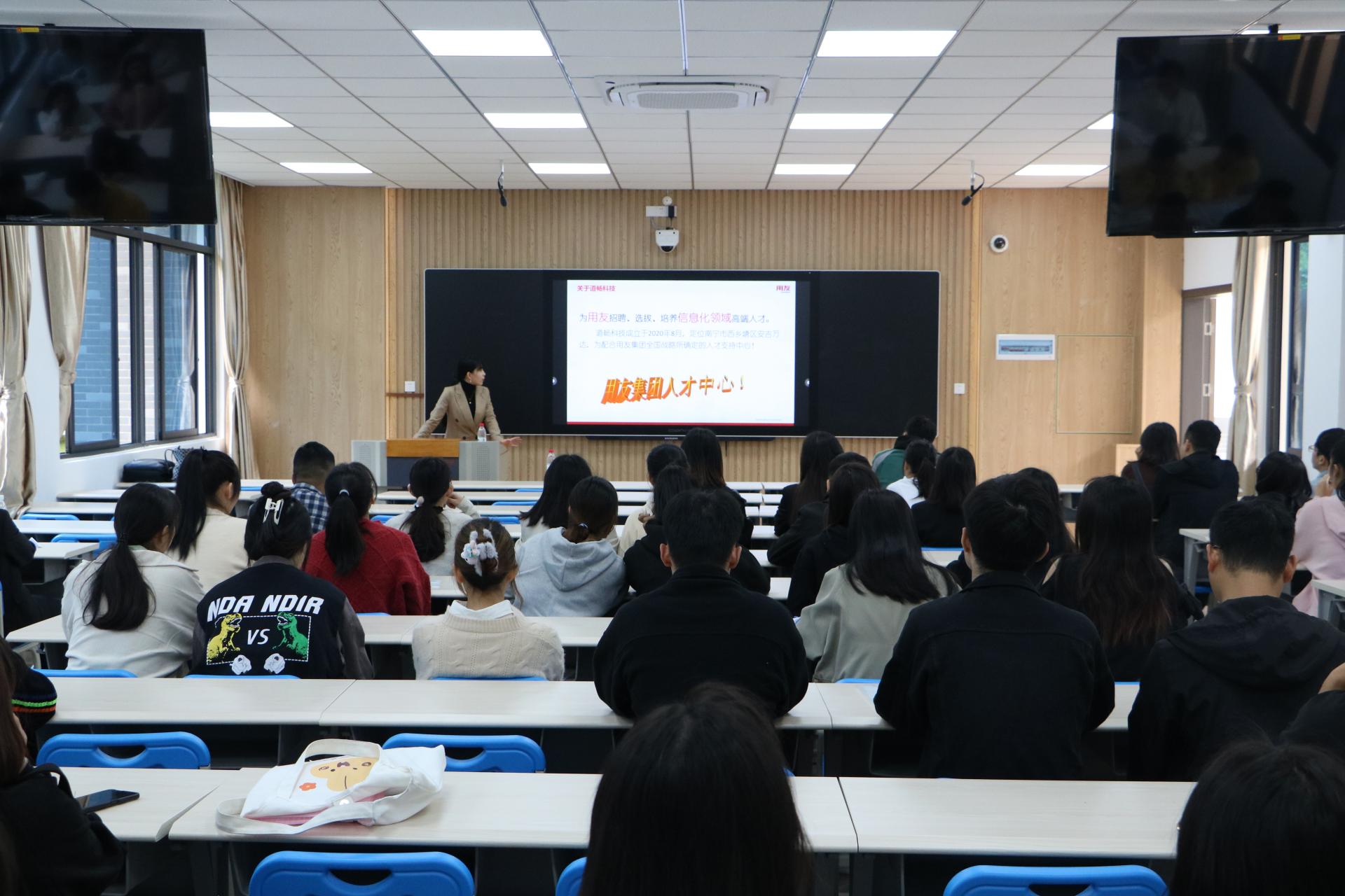 上午,广西道畅网络科技有限公司负责人梁悦女士首先介绍其公司成立于2020年8月,是为用友招聘、选拔、培养信息化领域高端人才,为配合用友集团全国战略所确定的人才支持中心。其次介绍了本次招聘会的招聘要求:第一,至少本科及以上学历,有较强的学习能力、语言沟通能力、逻辑思维能力;第二,希望从事信息化行业、企业管理相关工作;第三,计算机科学与技术、电子信息、金融学、经济学、人力资源、物流管理、工商管理、等计算机类、财经类等相关专业也在招聘范围内。招聘方希望应聘者能在培训期间努力学习,完善自己,提高自己,并表现出较好的学习能力,展现丰富的社会实践能力。梁悦女士提到在与我校合作中,参与实习的往届毕业生认真负责,在工作中表现优秀,并希望与我校继续保持合作。