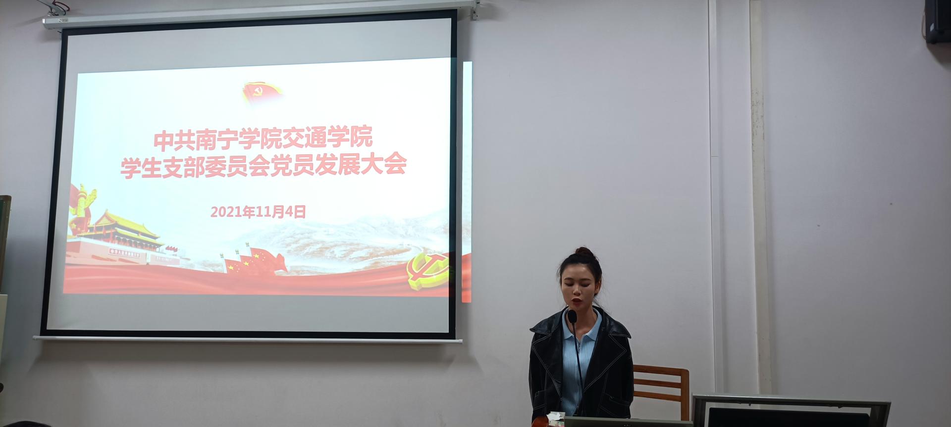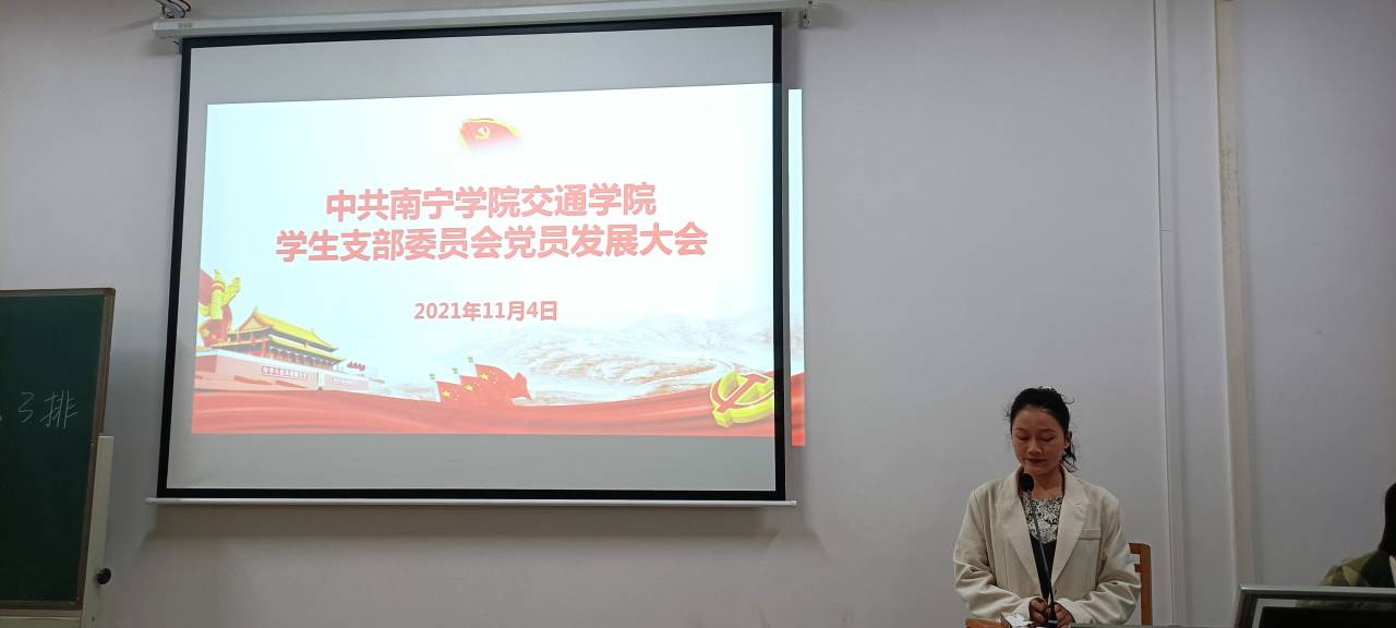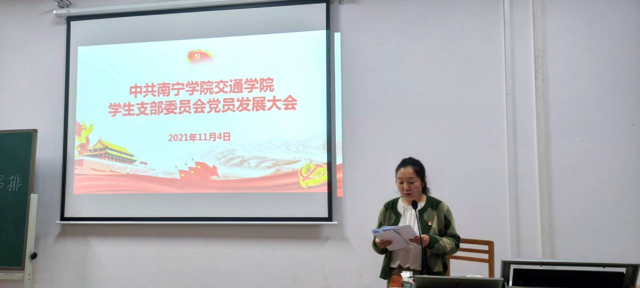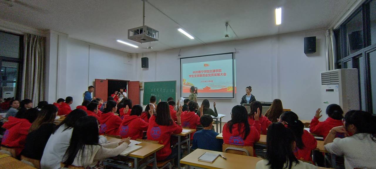 为响应党的号召,培养优秀党员。2021年11月4日交通学院学生党支部在南硅谷E502召开中共南宁学院交通学院学生党支部委员会发展党员大会。本次大会由交通学院学生党支部组织委员袁丽丽主持,参加会议的还有学生党支部书记蔡旭,党总支宣传委员陆维波,党总支统战委员王磊和交通学院辅导员蒋东霖、谢梦晴、谭文琪、玉俶瑜,全体在校党员同志、预备党员、发展对象。