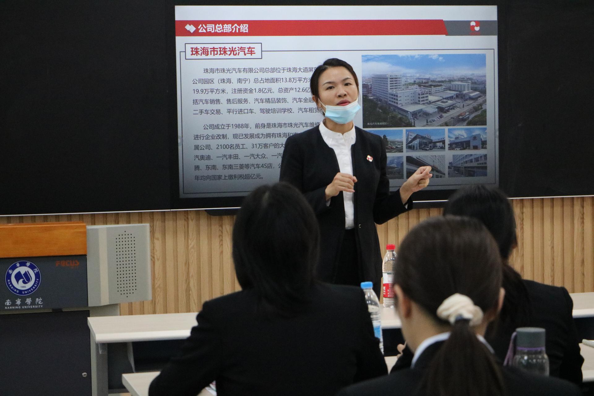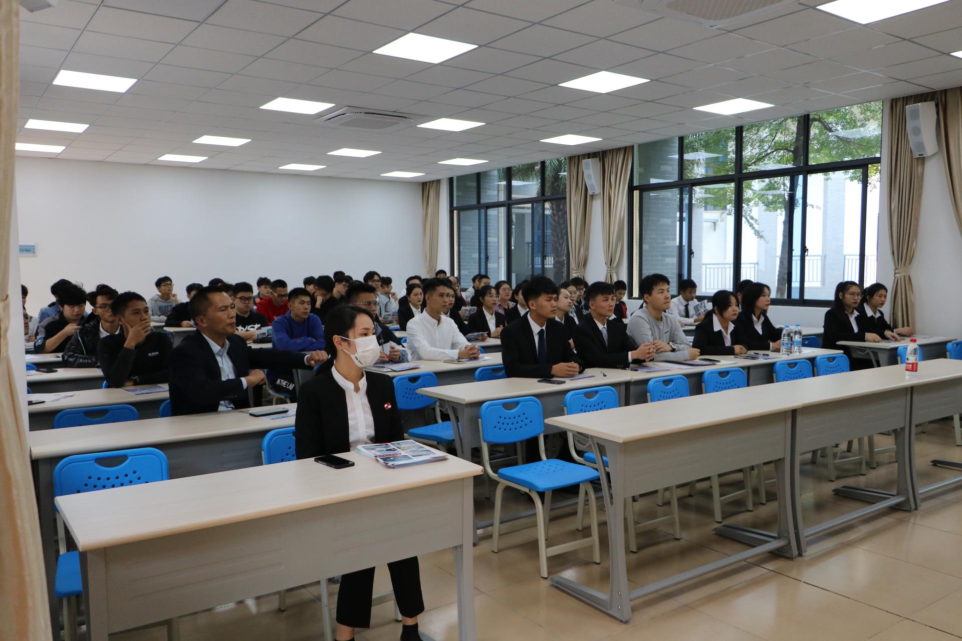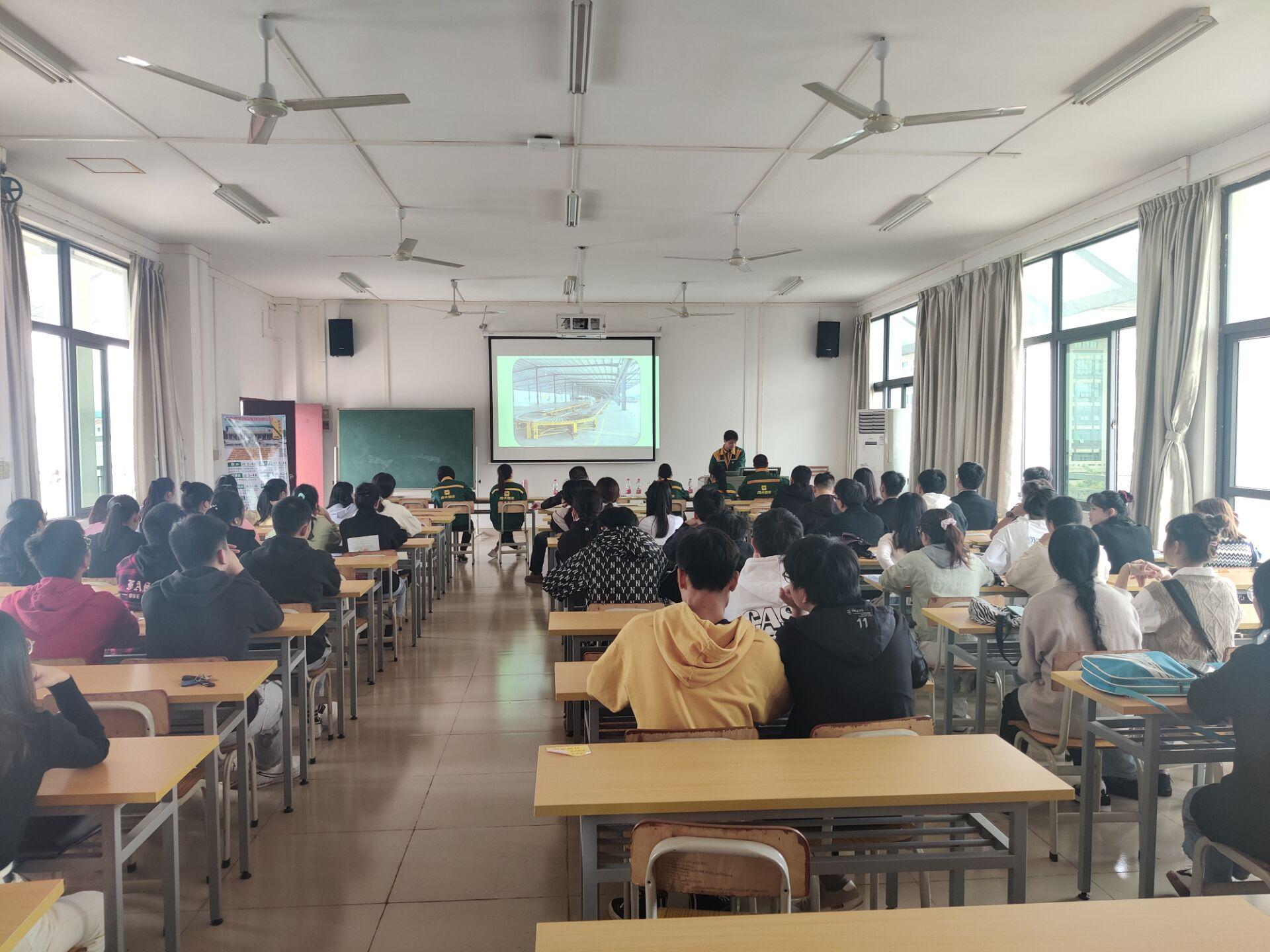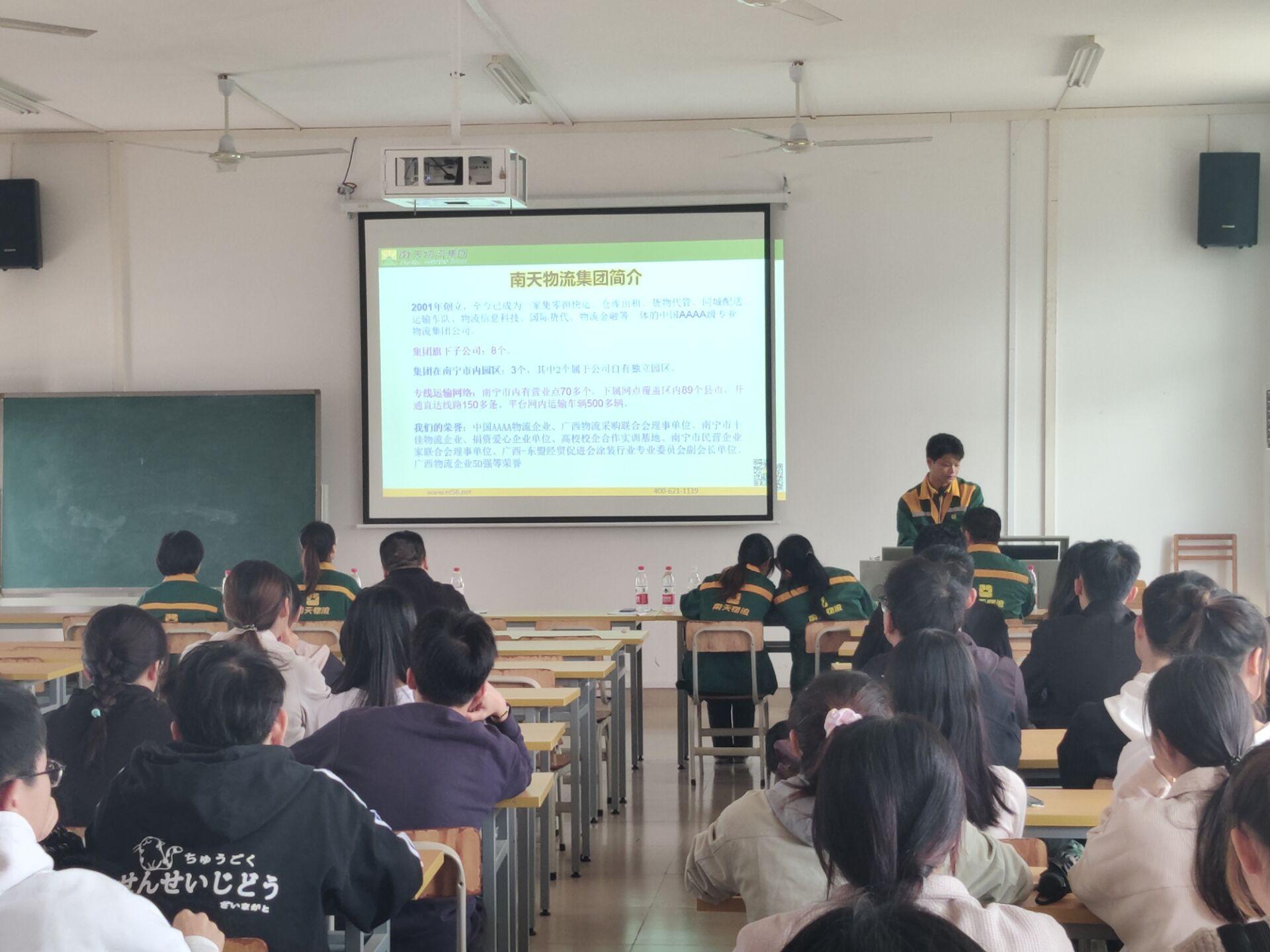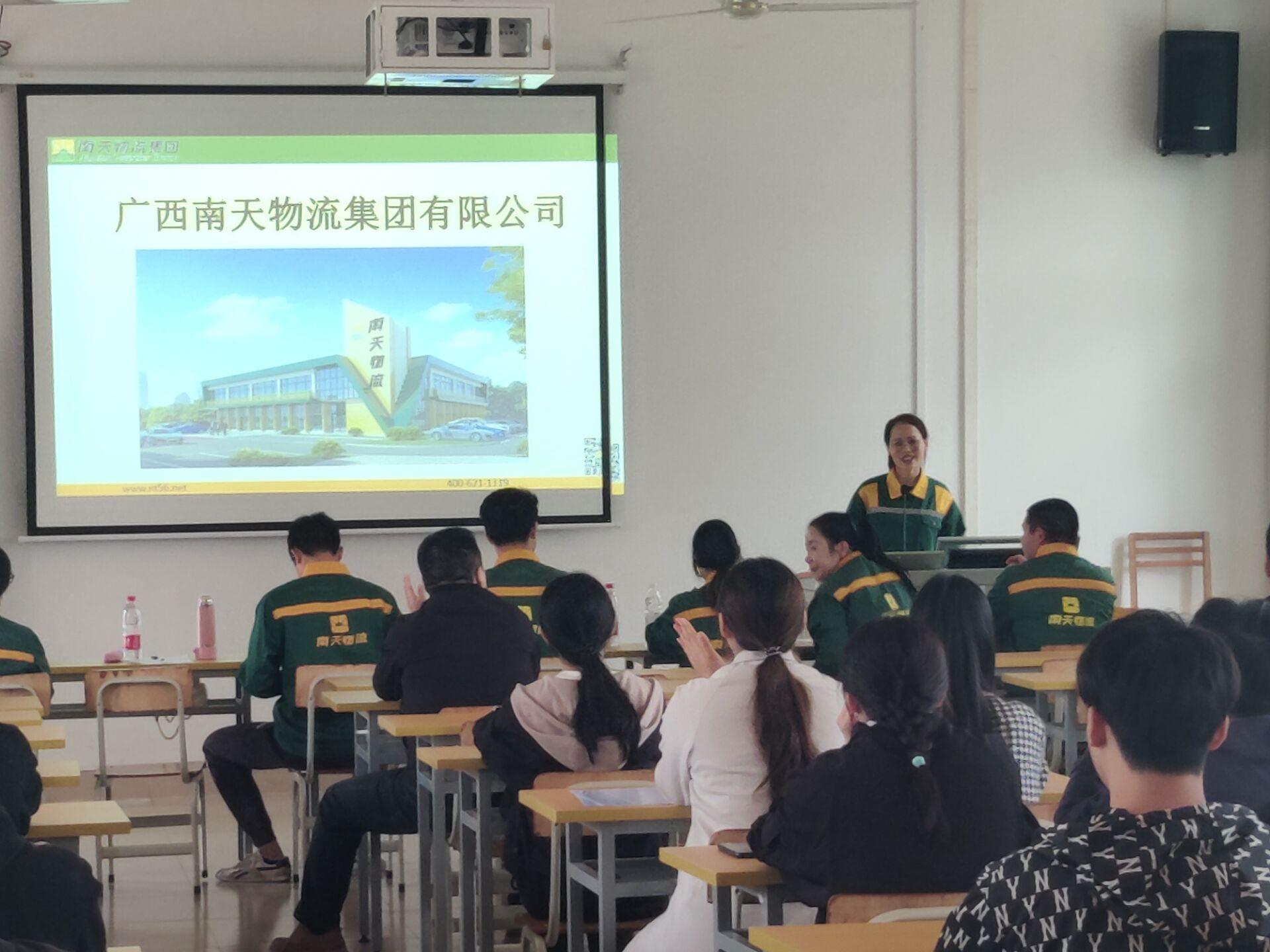 广西南天物流公司由货元甲运输主管将杰,介绍公司工作情况、工作待遇、住宿情况、饮食情况,并展示该公司在物流方面的六个强项;南天物流公司主管黄婷向同学们介绍了公司的企业文化、展示公司的仓库情况;已毕业的学姐进行工作经验分享,以自身为例讲述了在南天物流的成长经历。