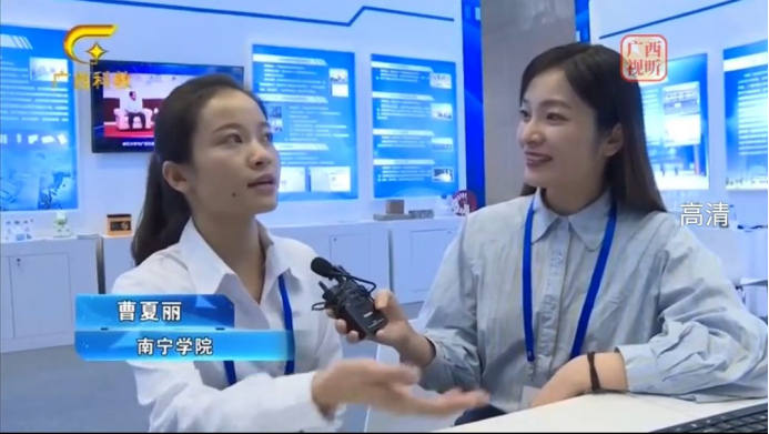 在展出期间,广西电视台来到南宁学院展位上采访我校师生,他们用专业且通俗易懂的介绍方式,向大家详细介绍了该平台的功能及在公司培训、教学上的使用价值等方面,得到媒体和观众一致好评。