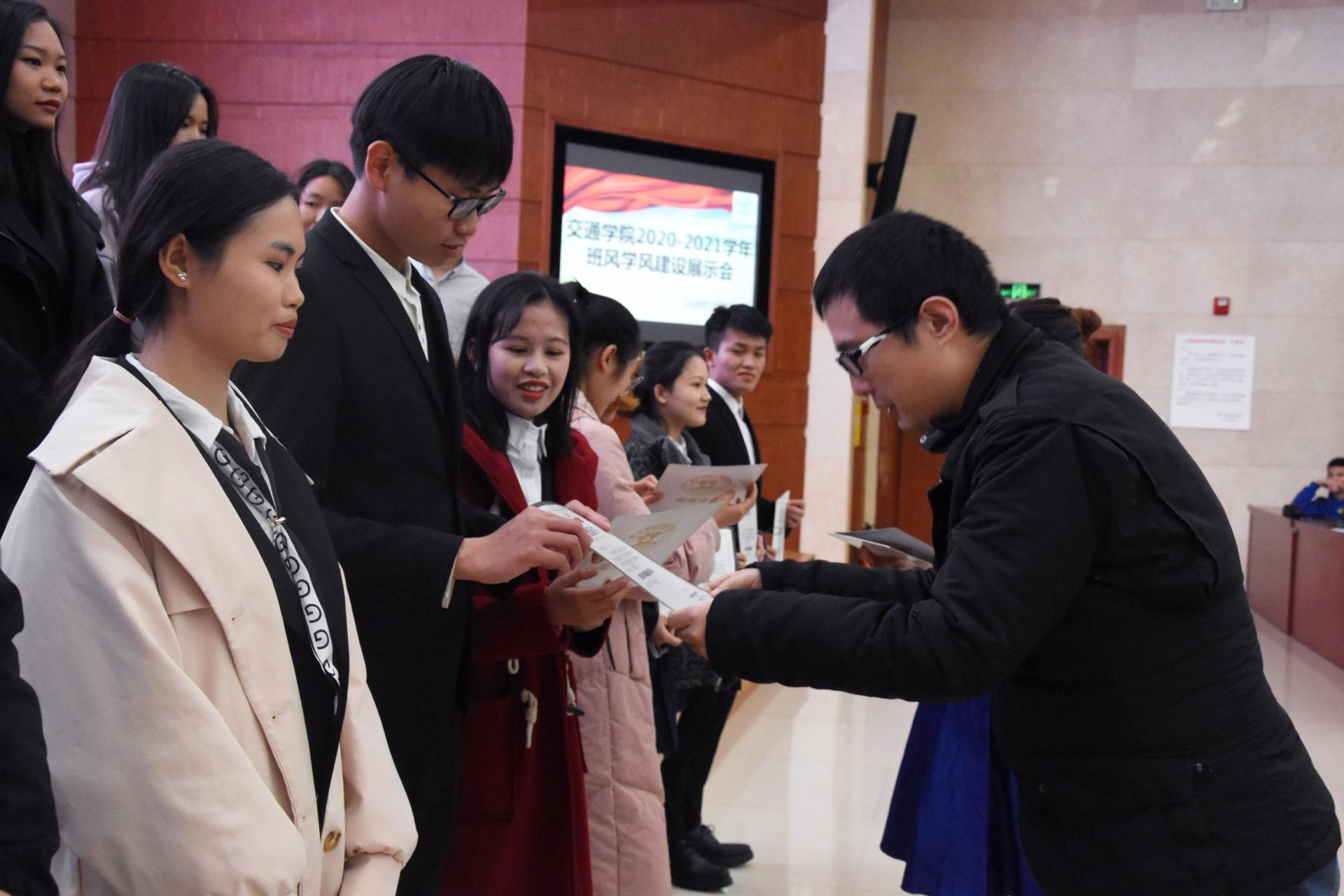 会议的第二项议程是由交通学院各基层班代表对自己的班级进行介绍与总结。汇报人代表衣着正装,用他们那洪亮且自信的声音与观众分享着自己本班的良好学风,对自己本班进行2019-2020学年班风学风汇报,汇报人代表讲述这一学年班级建设成果:班级获奖、班级个人获奖情况,班级发展党员人数,思想建设活动、宿舍卫生、图书借阅等。班级建设中存在的不足和提出解决方案,同时对2020~2021学年进行班级建设规划。