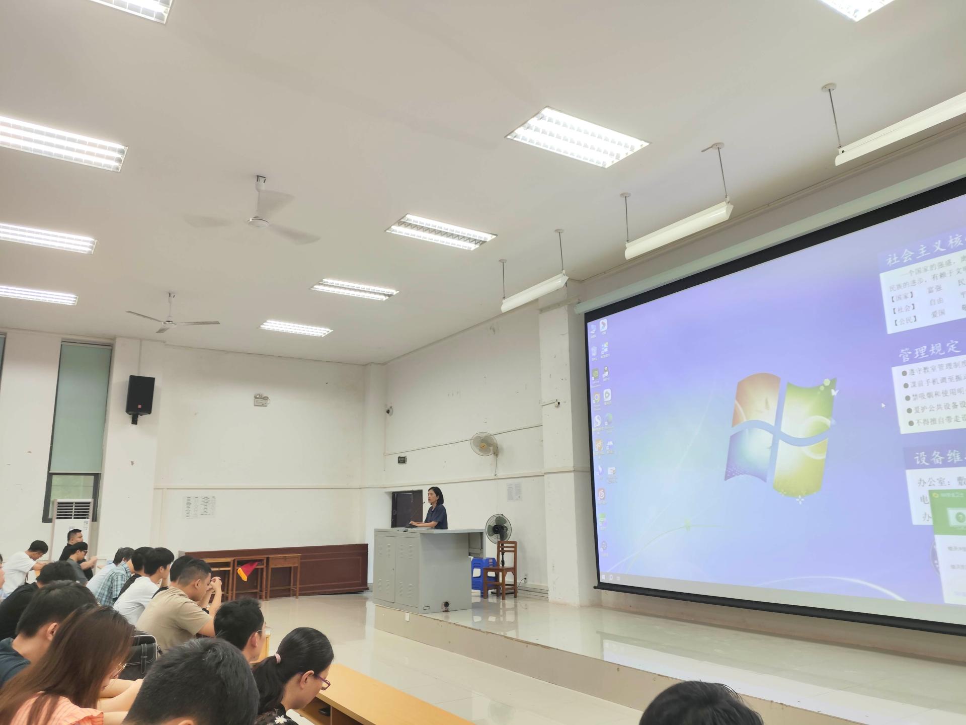 卢柳青书记讲述完毕后,汽车服务工程专业负责人禤旭旸老师对我校和汽车服务工程专业的发展史做了简要介绍,并对新同学的人才培养方案进行了说明,让同学们了解了本专业今后两年课程的安排。