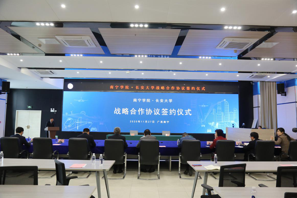 11月27日上午,南宁学院与长安大学战略合作签约仪式在广西交通云中心大楼8楼会议室举行。长安大学副校长贺拴海,发展规划处处长裴建中,科技处处长韩玲,社会合作处处长邓云潮,科学研究院综合办公室主任栾娟;南宁学院副校长兼中国-东盟综合交通国际联合实验室主任文旭光,交通学院院长陈红保等代表出席签约仪式。