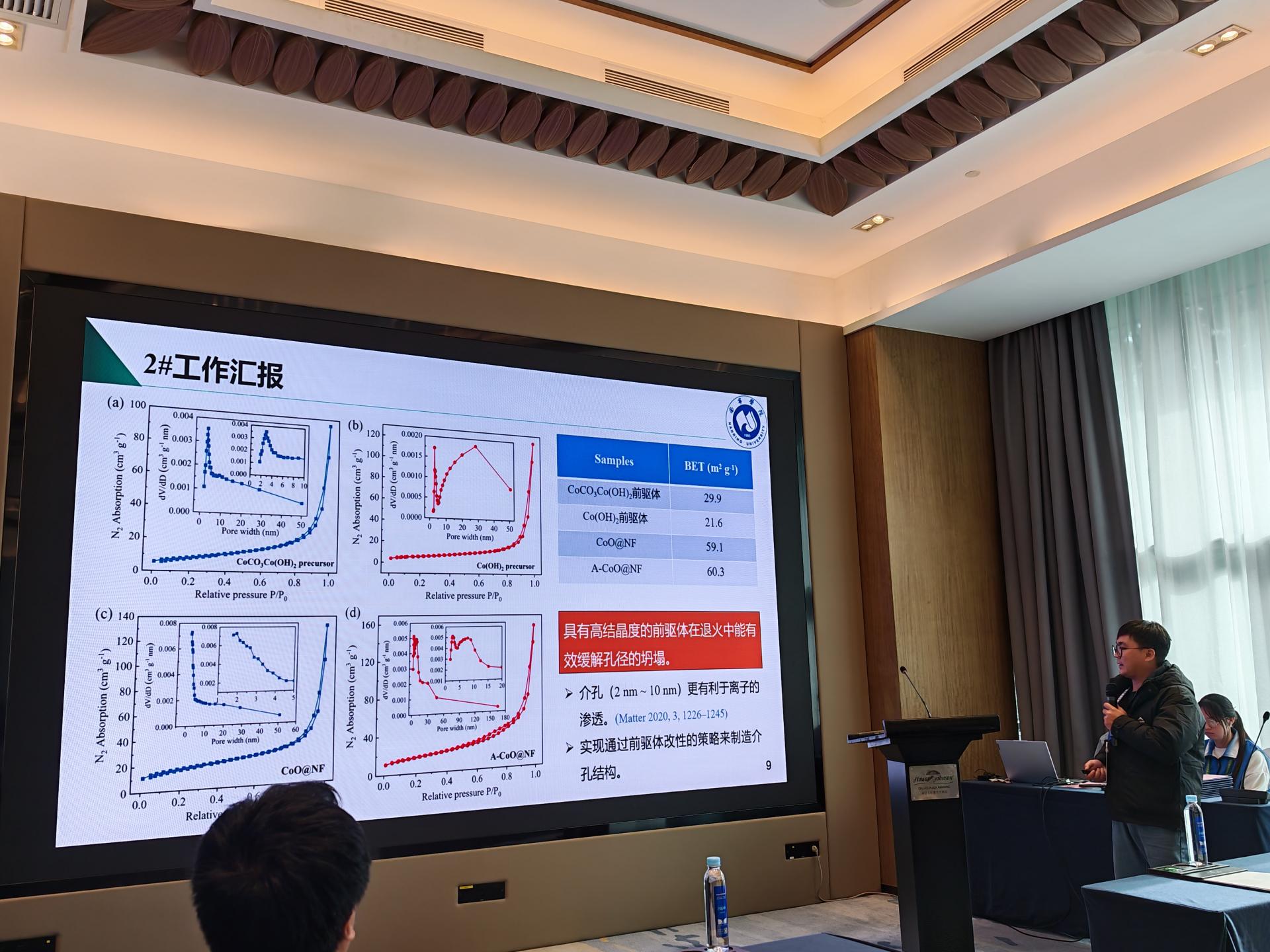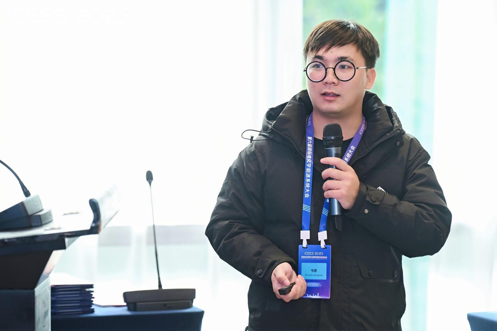 大会期间,交通运输学院韦赓博士受邀作题为“基于过渡金属氧化物和MXene的高性能超级电容器电极材料研究”的学术报告。报告聚焦过渡金属氧化物与MXene复合材料的结构设计、性能调控机制,深入阐释其在超级电容器领域的应用前景,系统展示了团队在该方向的前沿研究成果与创新思路。报告内容翔实、论证严谨,赢得与会专家学者的高度认可与热烈反响,充分彰显了学院在新能源材料研究领域的学术积淀与创新实力。
