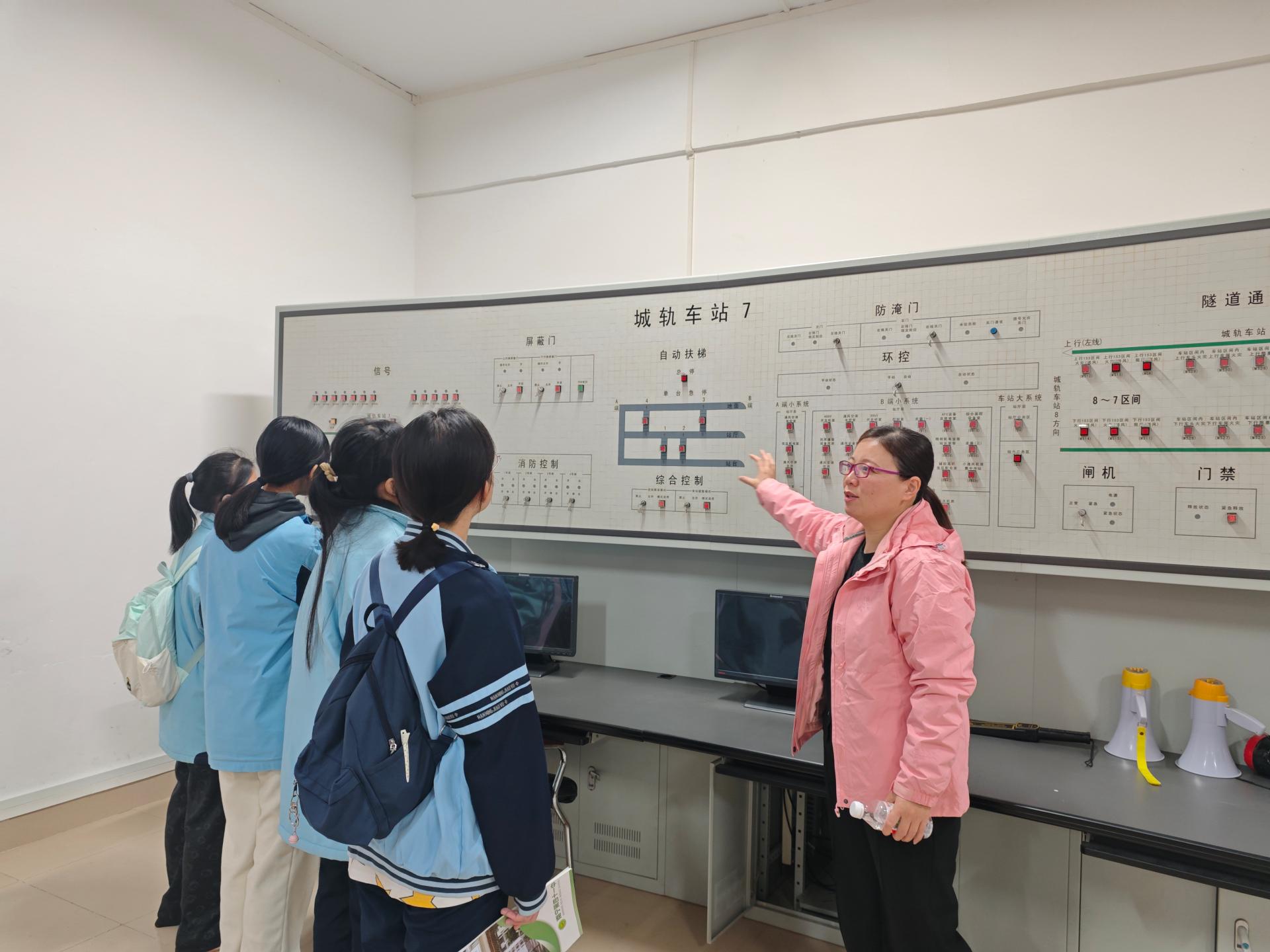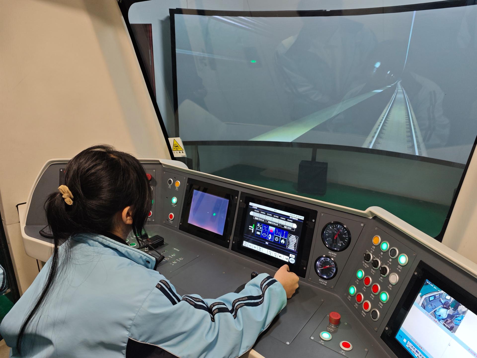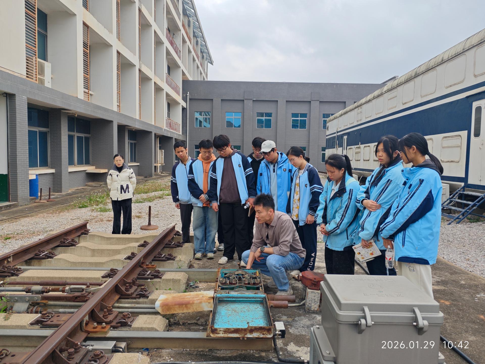 在讲解人员的引导下,研学团师生依次参观了多个交通专业实训平台与实验室。在列车模拟驾驶台,同学们通过高度还原的操控系统,亲身体验了列车驾驶流程,感受科技为轨道交通带来的精准与高效。随行讲解让大家对应答器、继电器、转向架等关键设备的功能有了直观认识。走进室外实训场地,同学们还动手体验手摇道岔操作,体会到安全与规范在轨道交通中的重要意义。行车调度实验室里,一个按1:40比例还原的场景沙盘吸引了众人的目光,通过模拟调度演示,师生们对列车运行组织有了进一步理解。站务系统实验室则呈现了客运服务的多个环节,BOM售票机、进出站闸机及模拟售票厅等设备,让同学们切身感受到客运组织与管理的日常运作。此外,研学团还参观了汽车服务实训室。室内陈列的自动驾驶车辆模型、变速器、电机等各类零部件,展示了汽车工程技术的丰富内涵,也拓宽了大家对综合交通运输体系的认知视野。
