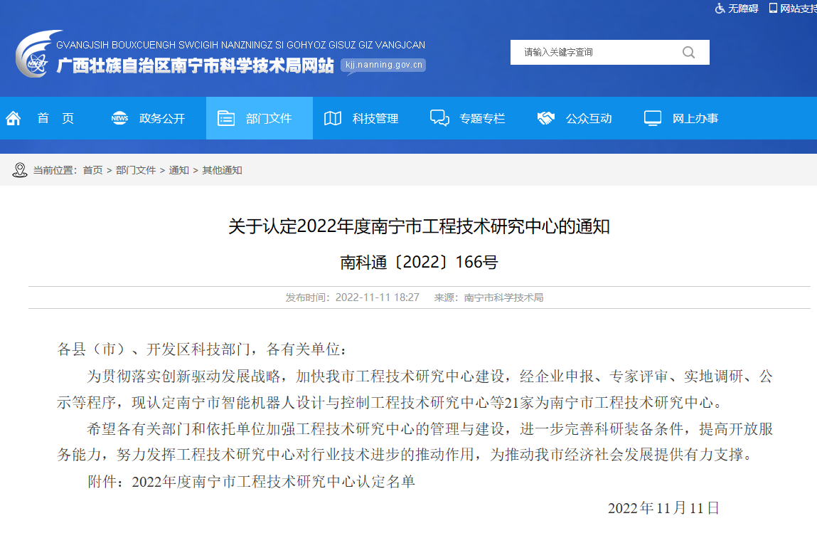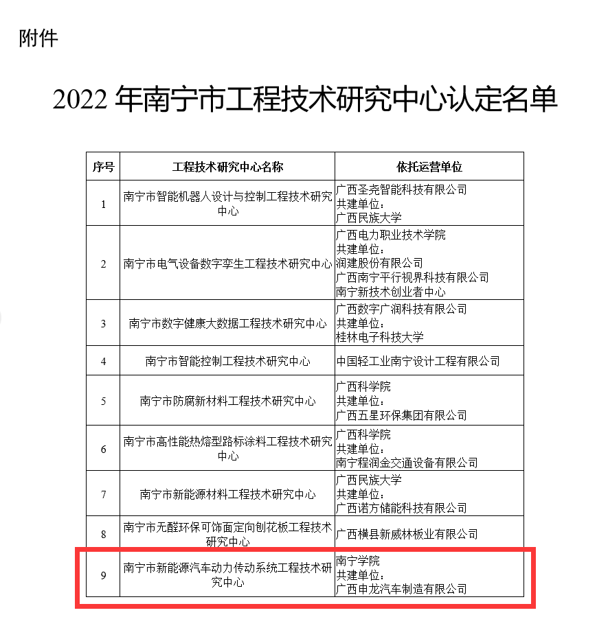 11月11日,根据南宁市科技局发布的《关于认定2022年度南宁市工程技术研究中心的通知》(南科通〔2022〕166号),由南宁学院交通运输学院牵头联合广西申龙汽车制造有限公司申报的《南宁市新能源汽车动力传动系统工程技术研究中心》获批2022年度南宁市工程技术研究中心。