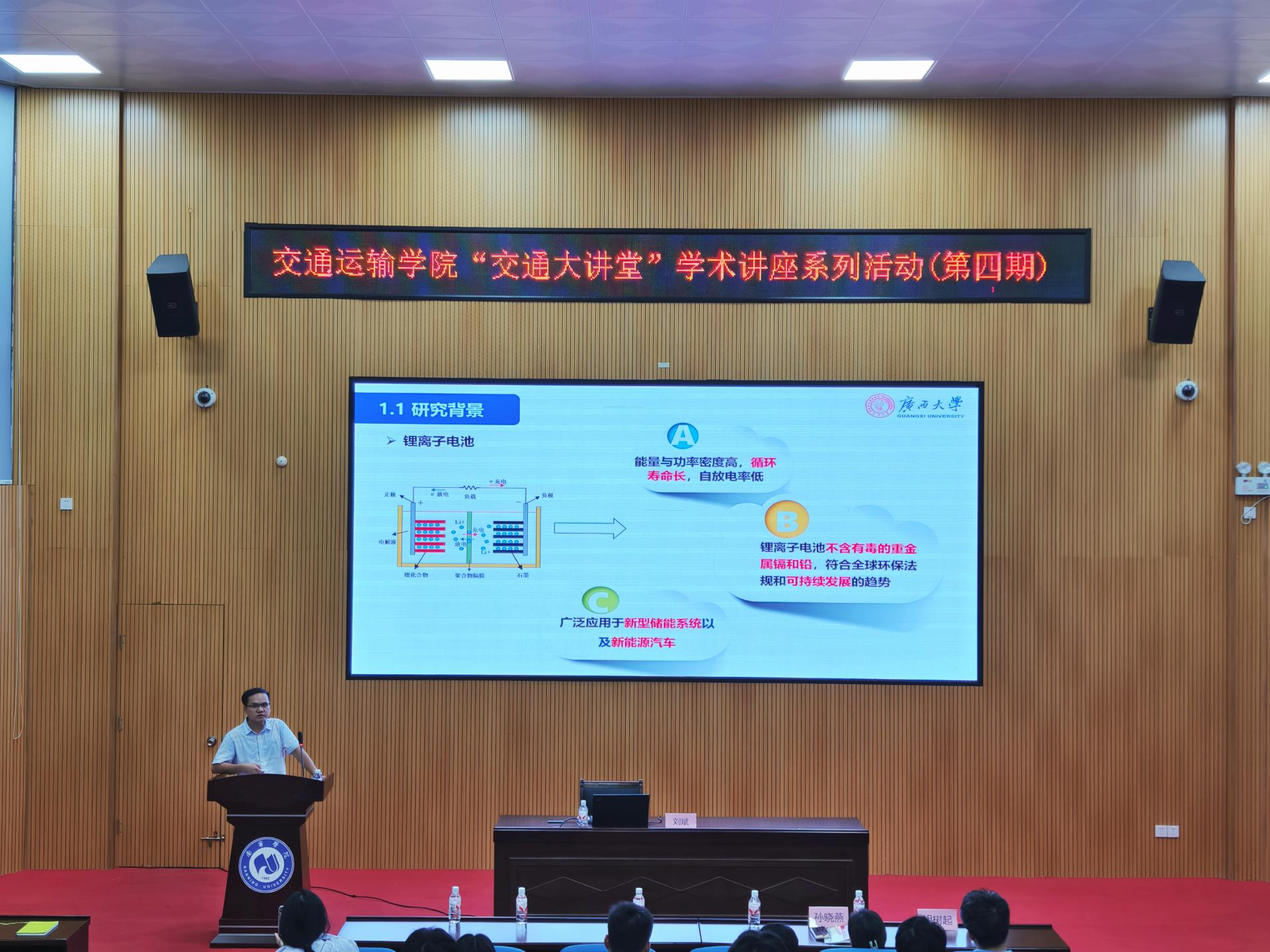 2025年9月18日上午,交通运输学院第四期“交通大讲堂”学术讲座系列活动成功举办。本次讲座由交通运输学院副院长庞彦知教授主持,特邀广西大学刘斌教授、南宁学院孙晓燕教授及胡树起副教授3位专家,分别围绕新能源存储、交通行为研究、材料表征技术等前沿领域进行专题分享,吸引了学院100余名师生积极参与。