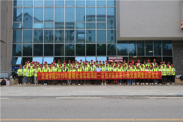 2019年7月15日交通学院7名老师和94名学生在学校学生活动中心举行出征仪式,前往广西西部8个县,24条公路开展交通调查社会实践项目。该项目是自治区交通规划勘察设计研究院开展《广西高速公路网规划(2018—2030年)》前期调查的重要内容。为了落实习近平总书记对广西的“三大定位”,形成中南西南地区链接粤港澳大湾区和东盟地区出省出海边干结合的高速公路网络,2018年8月24日自治区十三届人民政府第14次常委会研究审议通过了《广西高速公路网规划(2018—2030年)》。