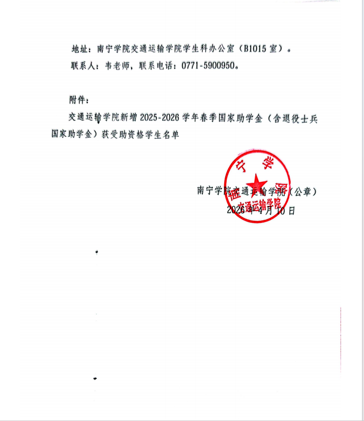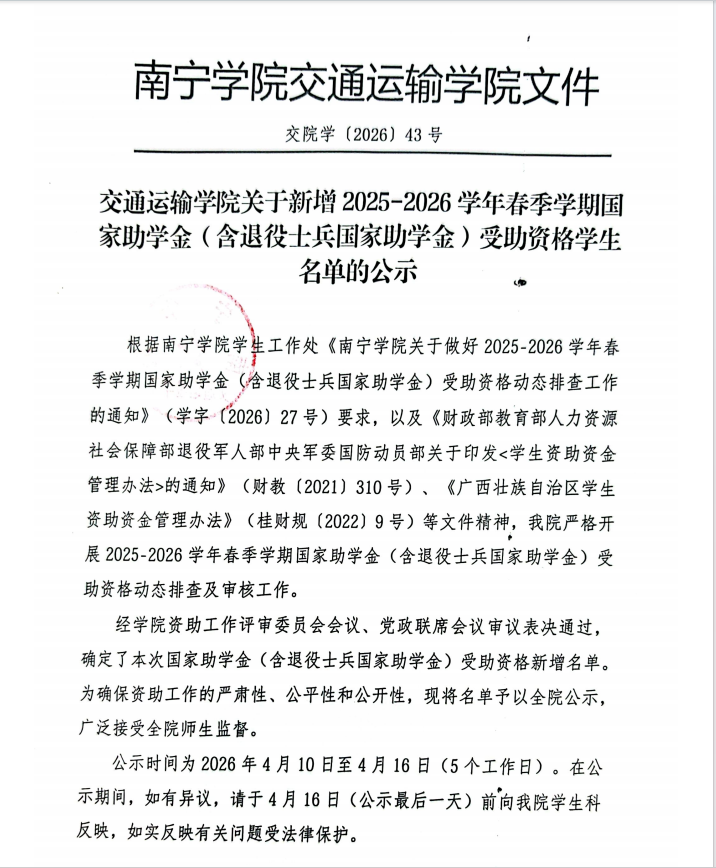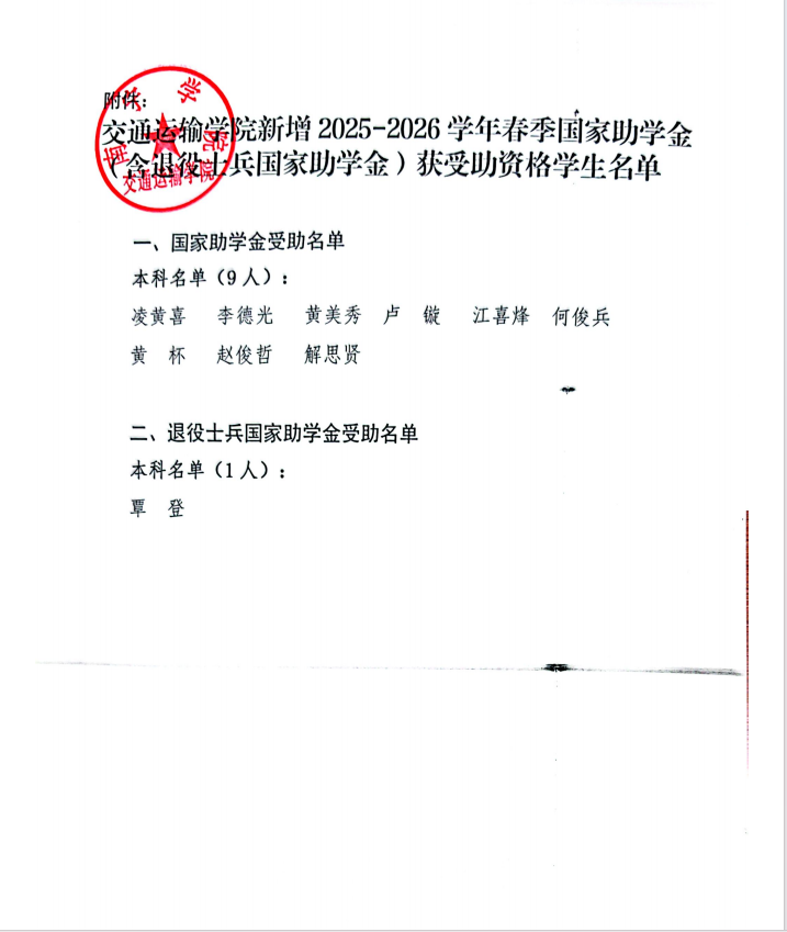 交通运输学院关于新增2025-2026学年春季学期国家助学金(含退役士兵国家助学金)受助资格学生名单的公示